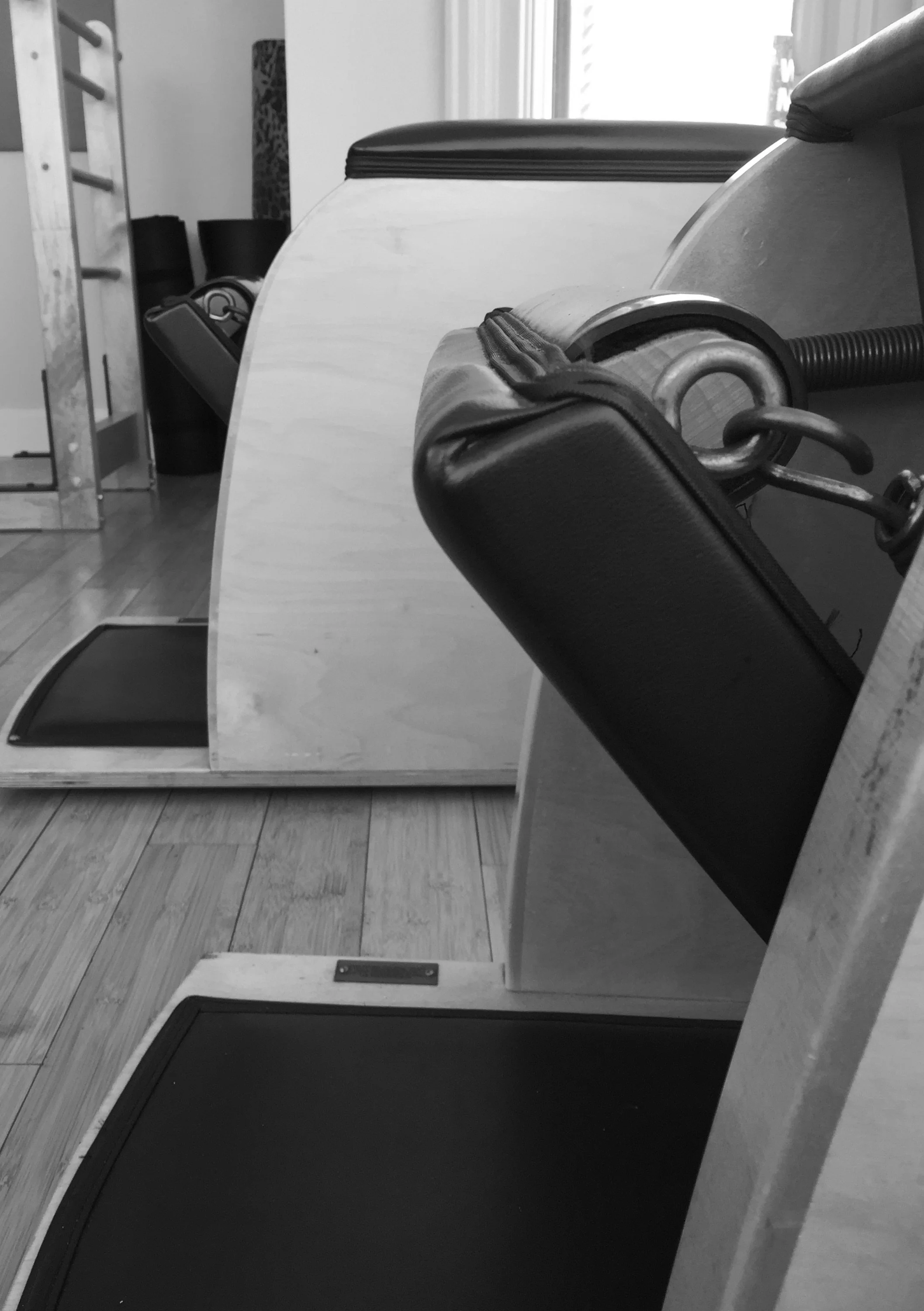 Joseph Pilates designed all of the equipment we continue to use today. The Reformer: a carriage you move by working the tension of multiple springs. This may be done in all planes of movement. The Cadillac: a large mat or table within a metal pipe frame. All mat exercises may be performed here with added springs to help the connection of the body either into itself or to reach more distally. The Chair: my personal favorite. A smaller piece of equipment where many balances or imbalances are found. A great place to work on posture, entire core, balance and general strength. Classes are taught via zoom or in person on any one of these pieces equipment specified in the schedule.